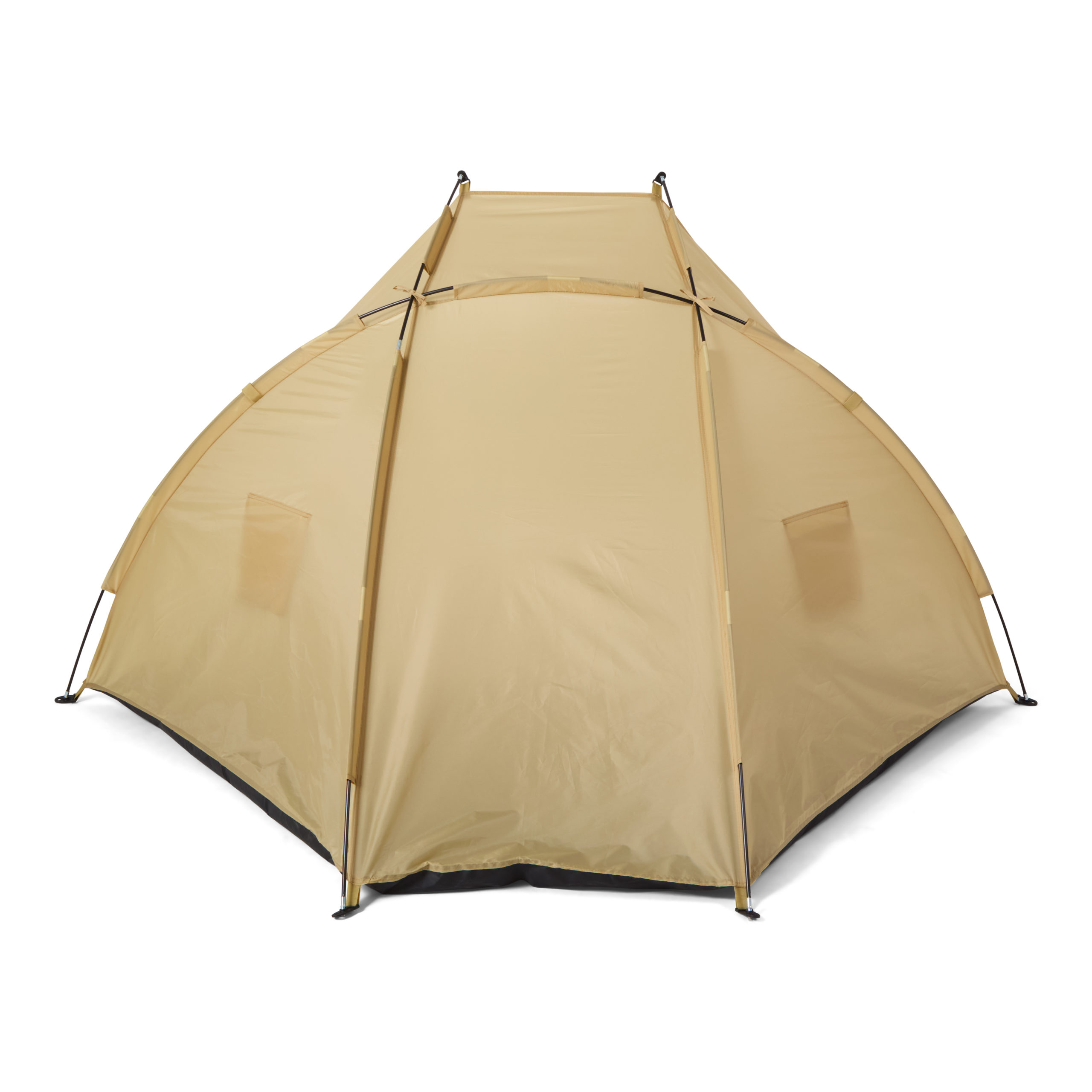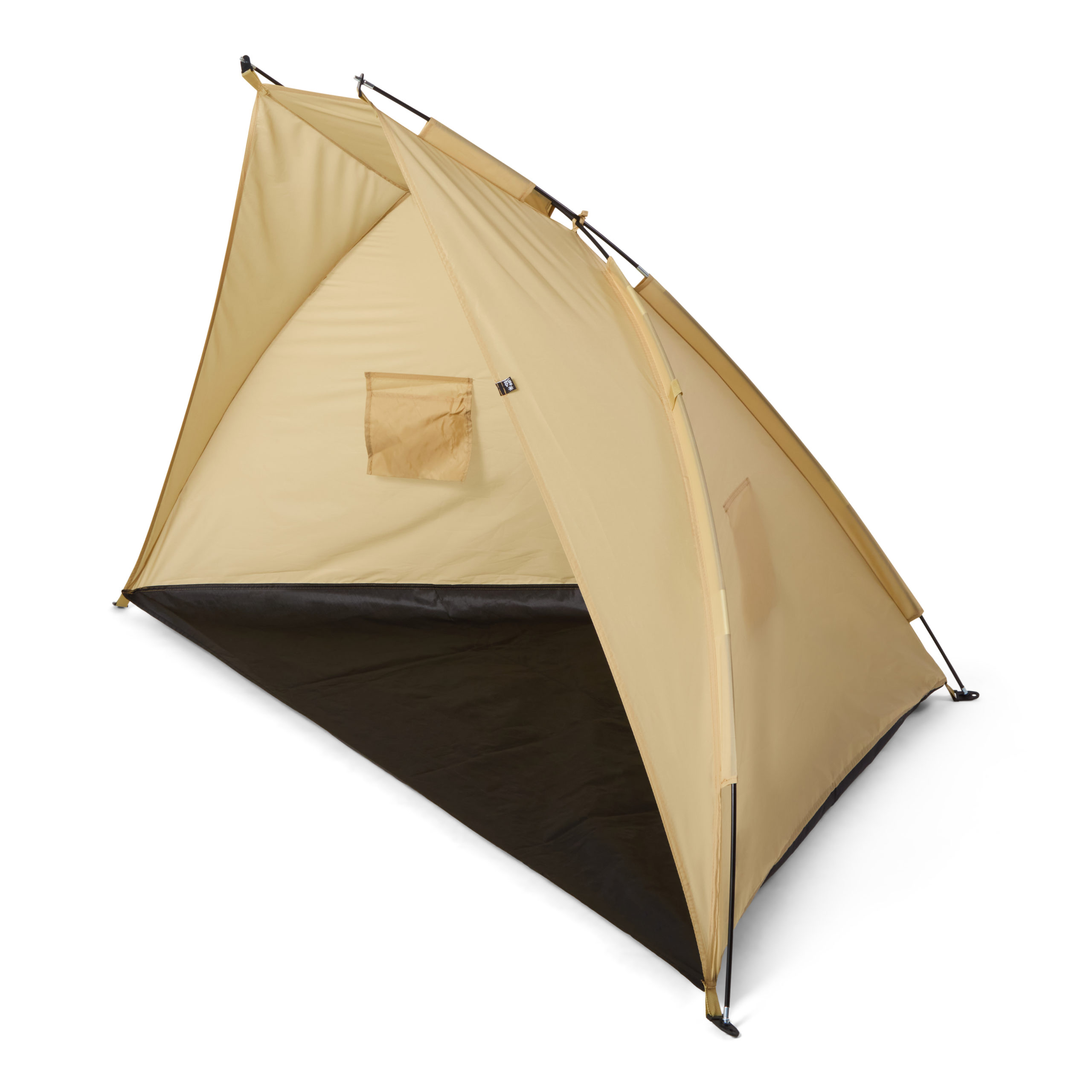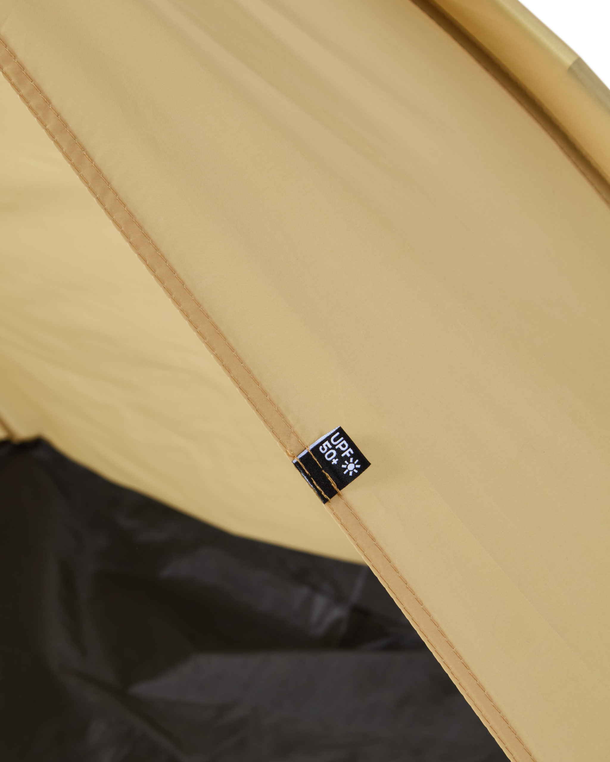 Dette strandteltet er litt større og rommer en voksen samt barn og gir en UV beskyttelse på UPF 50+. Strandteltet monteres raskt og enkelt med medfølgende teltstenger. OBS! Disse kan bøyes, så vær forsiktig når de bøyes ved montering. Strandteltet leveres med en smidig transportveske som har skulderbånd slik at det lett kan slenges opp på skulderen ved transport.