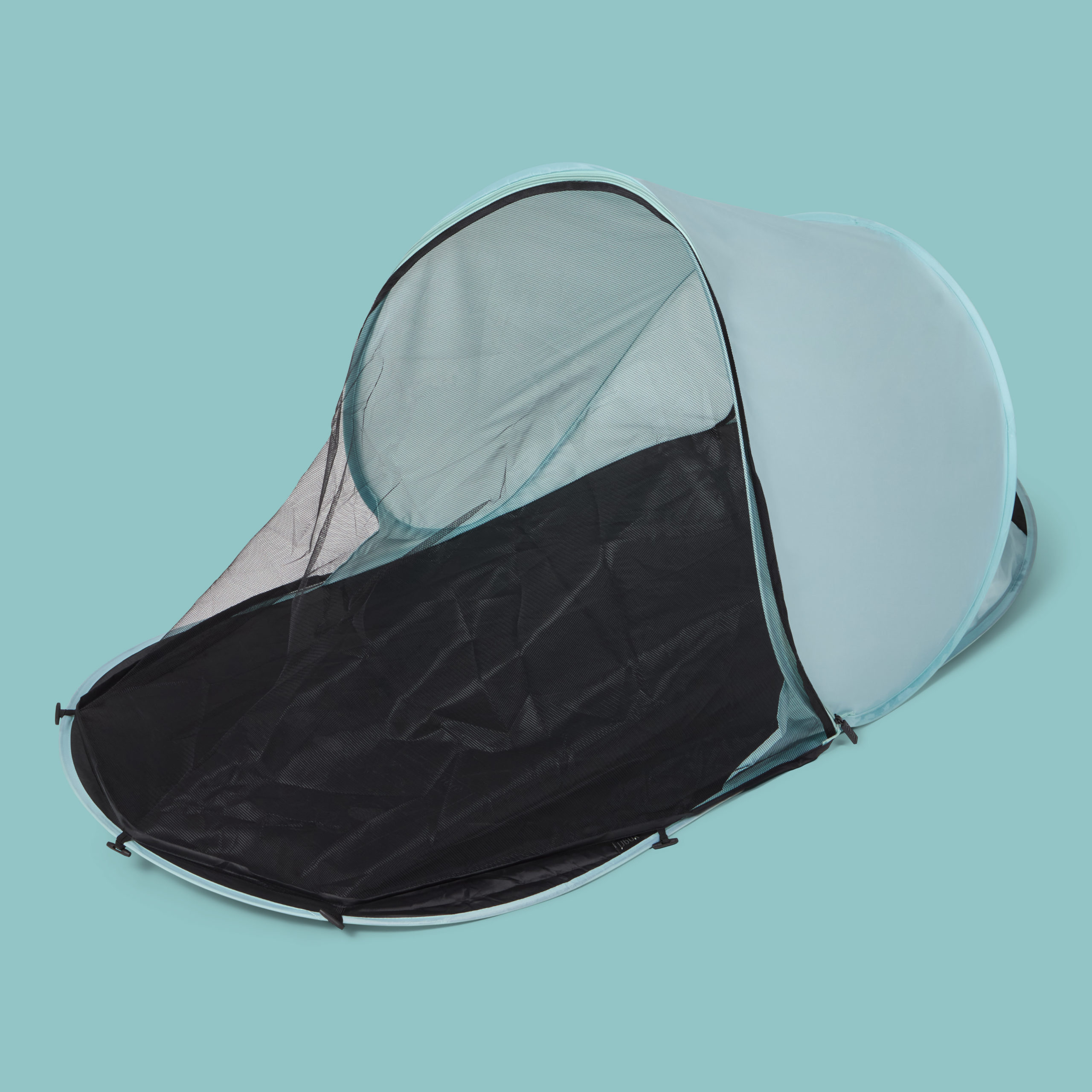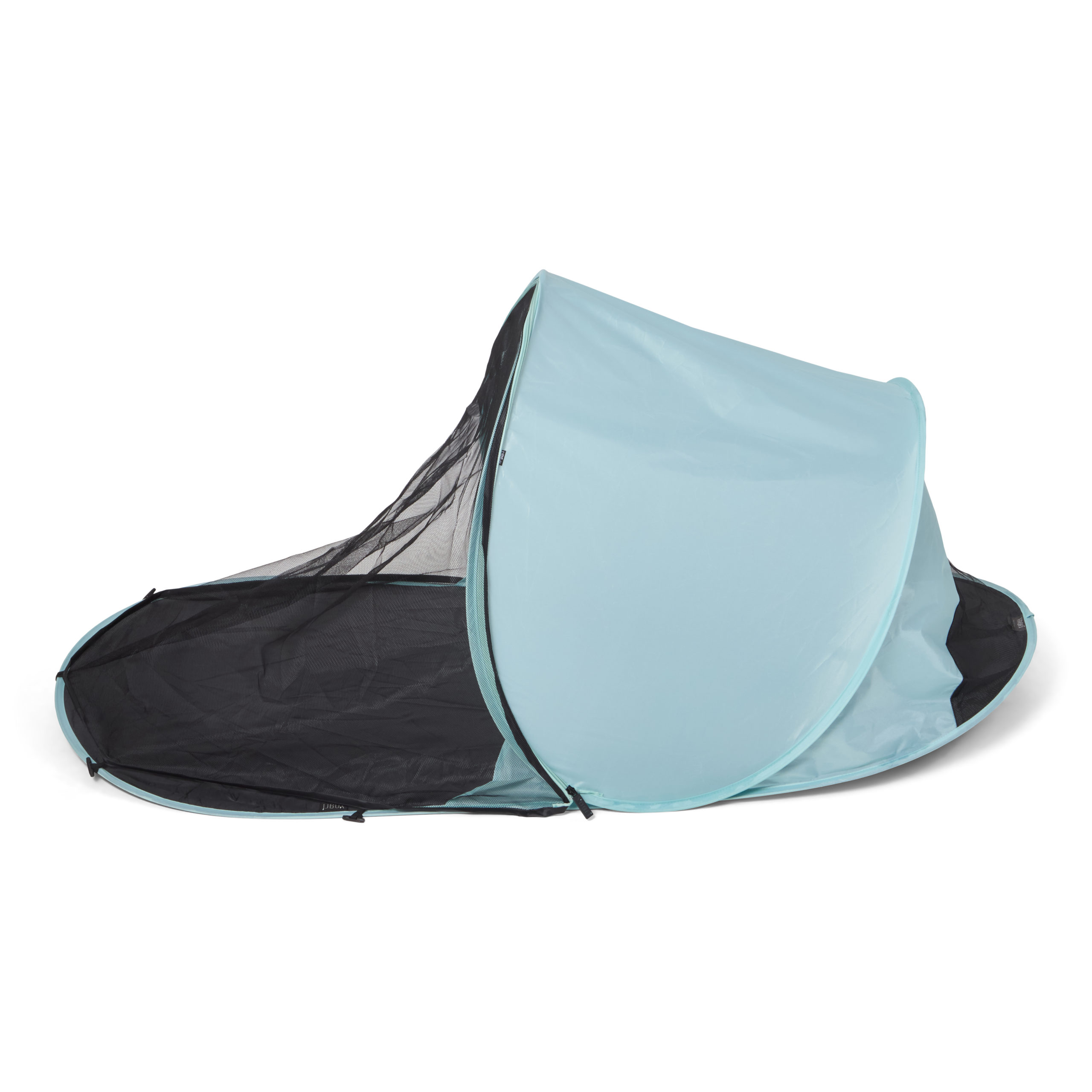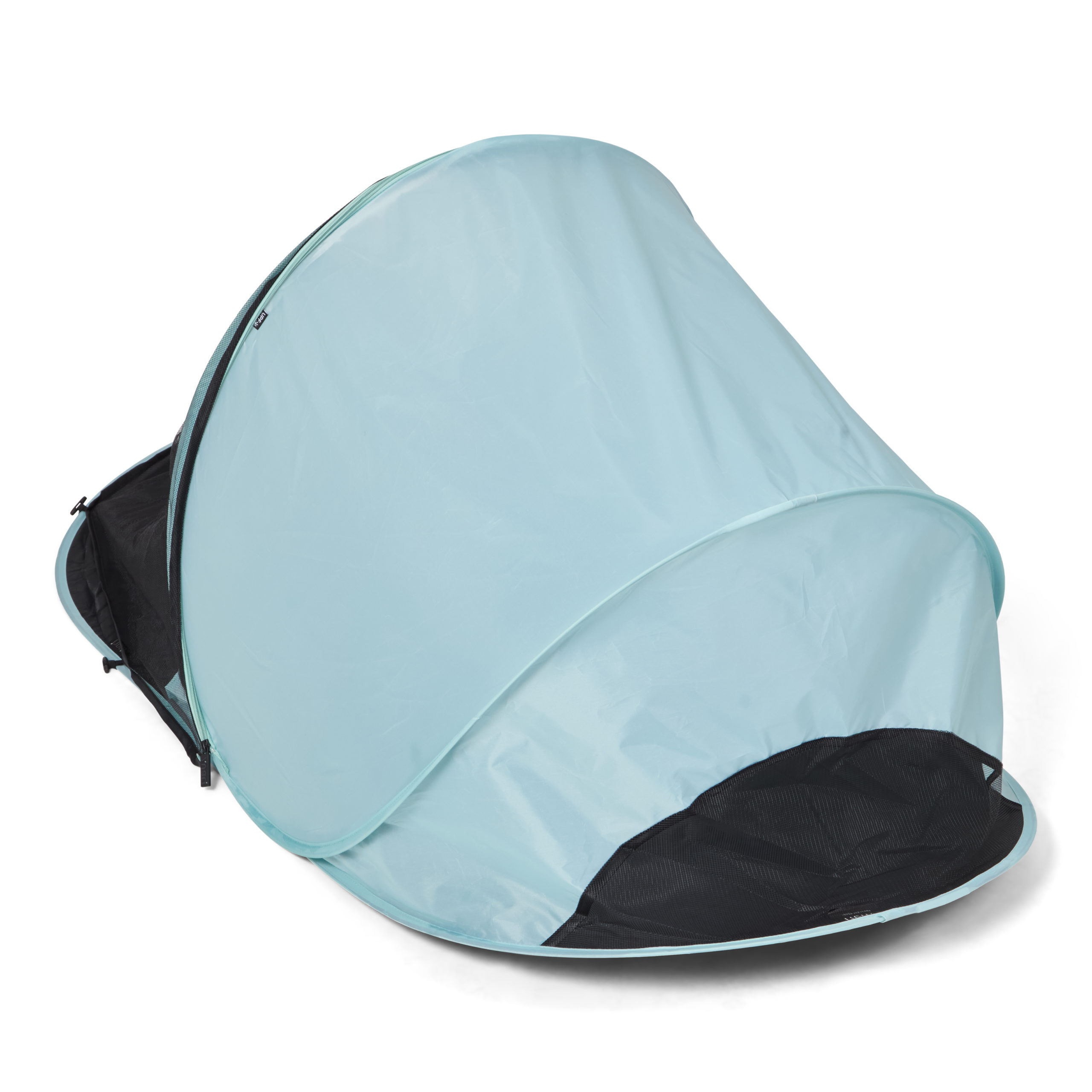 Dette strandteltet er litt mindre og rommer ett barn og gir en UV beskyttelse på UPF 50+. Strandteltet monteres raskt og enkelt ved å bare vikle det ut og det vil da slå seg selv opp (pop up). OBS! Les gjennom instruksjonene nøye før bruk, siden teltet slår seg opp selv må instruksjonene følges. Skal man felle sammen strandteltet så skal dette utføres nøye etter instruksjoene. Baby strandteltet kommer med en smidig transportveske som har skulderbånd slik at det er lett å slenge opp på skulderen ved transport.