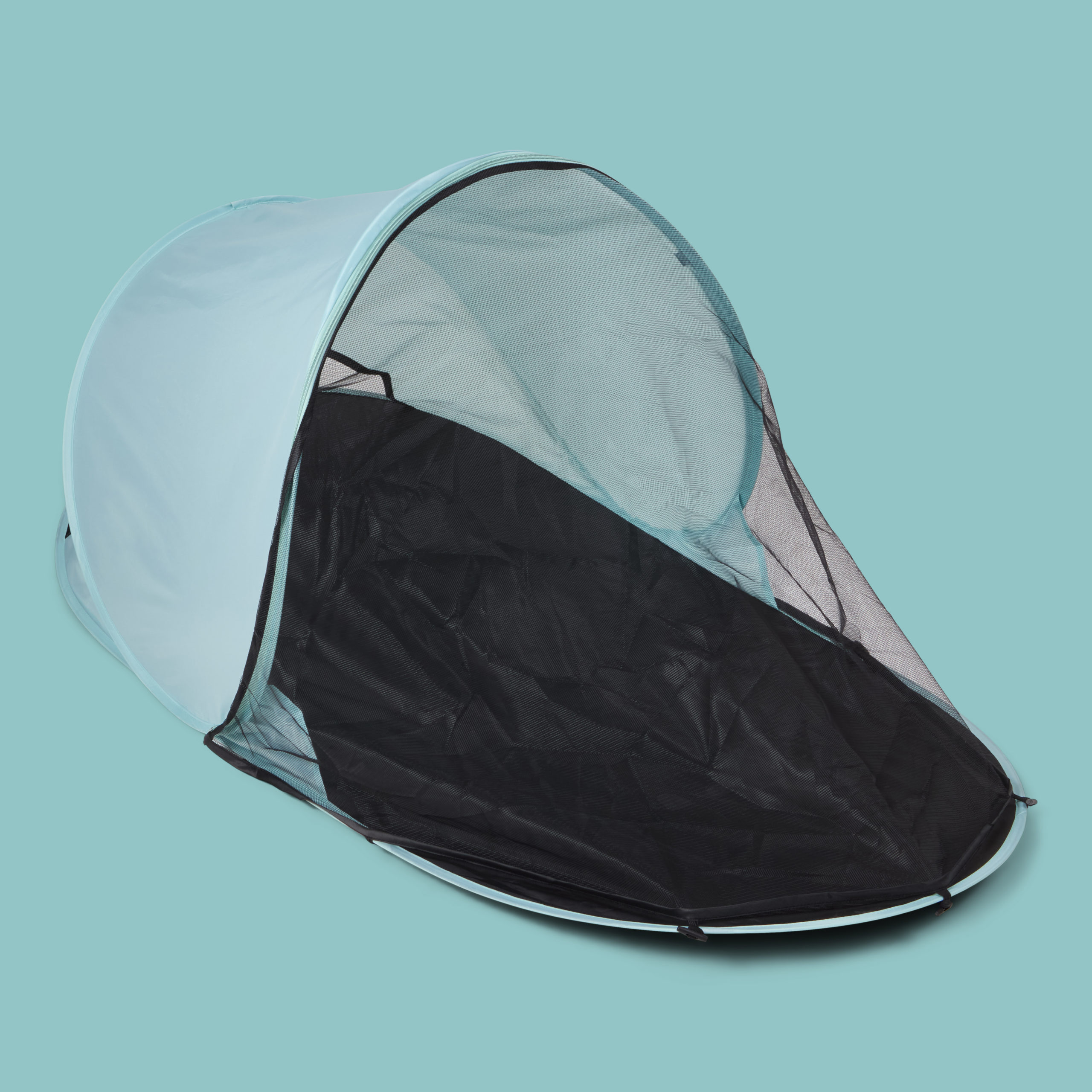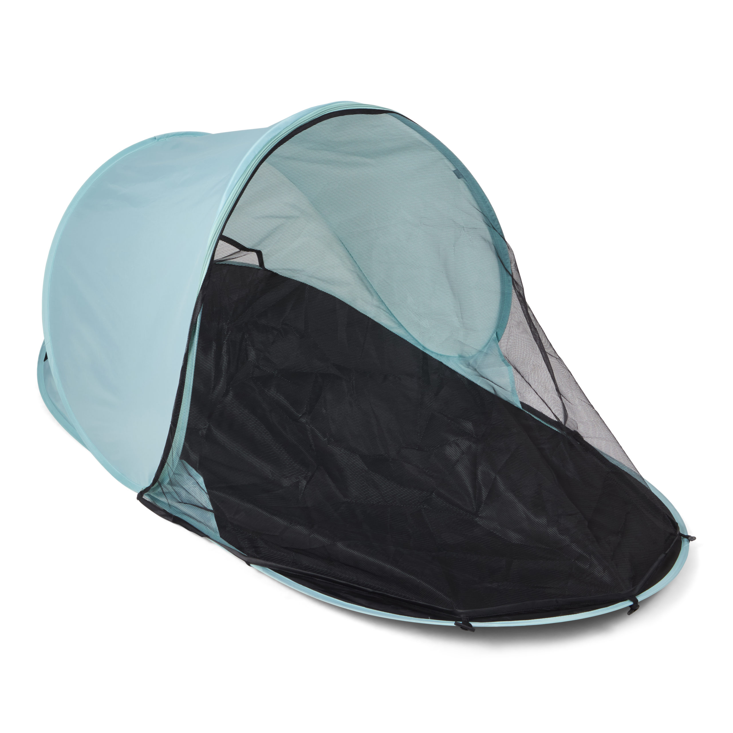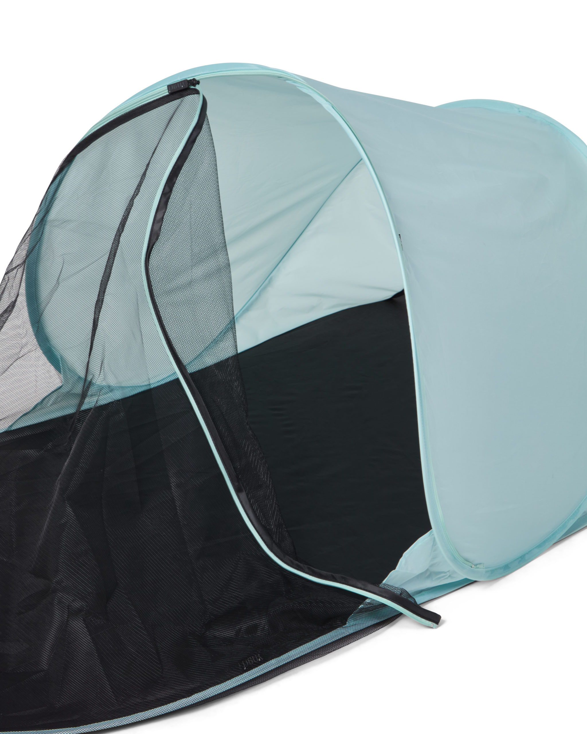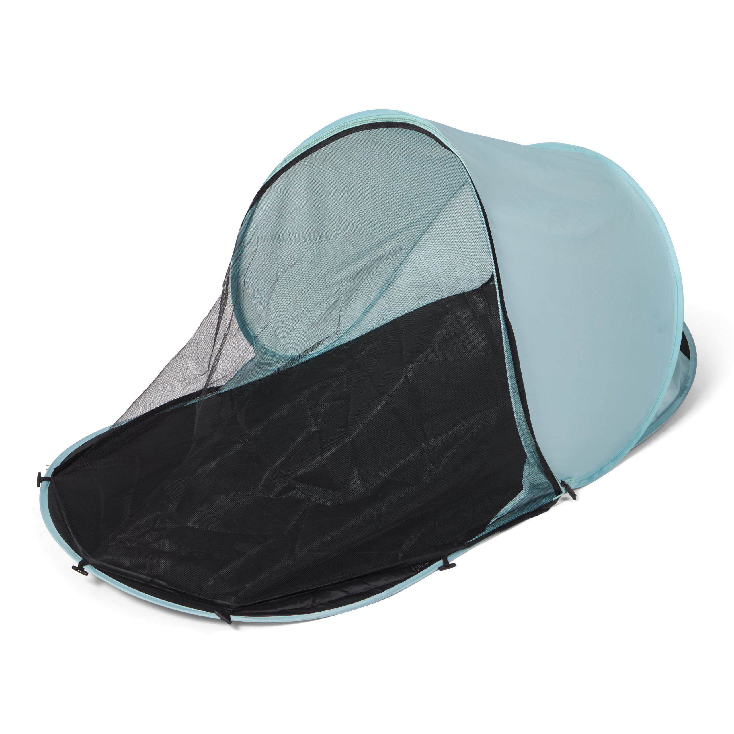 Dette strandteltet er litt mindre og rommer ett barn og gir en UV beskyttelse på UPF 50+. Strandteltet monteres raskt og enkelt ved å bare vikle det ut og det vil da slå seg selv opp (pop up). OBS! Les gjennom instruksjonene nøye før bruk, siden teltet slår seg opp selv må instruksjonene følges. Skal man felle sammen strandteltet så skal dette utføres nøye etter instruksjoene. Baby strandteltet kommer med en smidig transportveske som har skulderbånd slik at det er lett å slenge opp på skulderen ved transport.